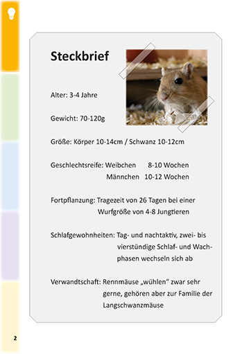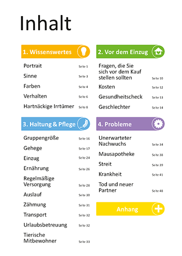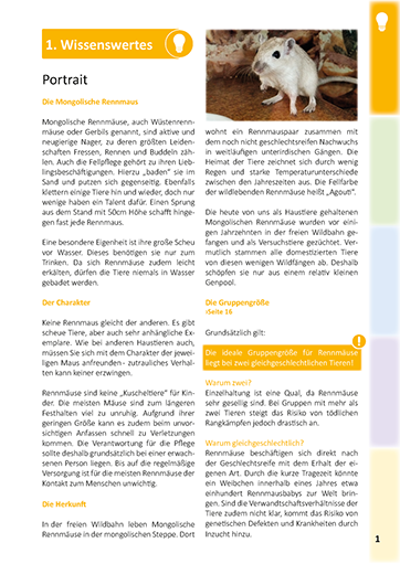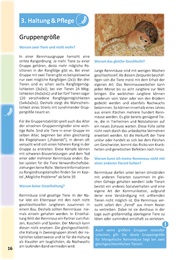 Das Basisbuch ist ideal für Einsteiger in die Rennmaushaltung. Es behandelt alle gängigen Fragestellungen rund um die Haltung Mongolischer Rennmäuse. Durch das praktische Format ist es bei Fragen schnell griffbereit und ermöglichen rasche, praxisorientierte Hilfe ohne langwierige Recherche im Internet. Auch erfahrenere Halter werden fündig.
